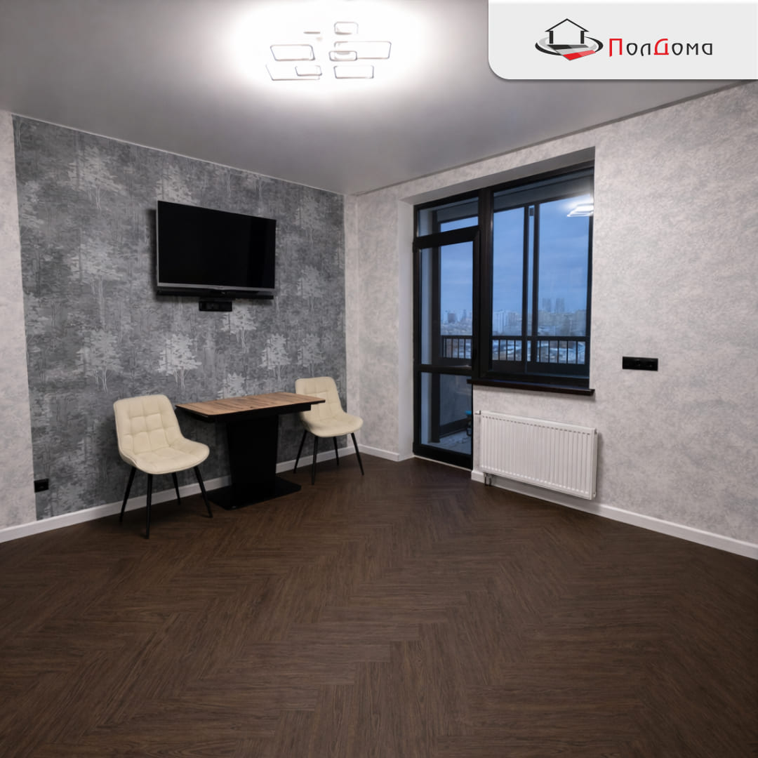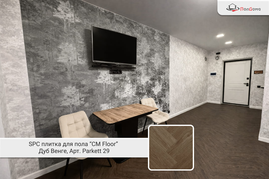В квартире на улице Кутузова, 36, решили обновить пол — подошли к этому основательно, с желанием сделать красиво и надолго. Выбор пал на SPC-покрытие «CM Floor» Parkett 29 с фактурой дуба венге. Доски размером 610×122 мм и толщиной 5,5 мм идеально подошли под задачу: они стабильны, не боятся перепадов температуры и влажности, а благородный тёмный оттенок добавил интерьеру глубины.
